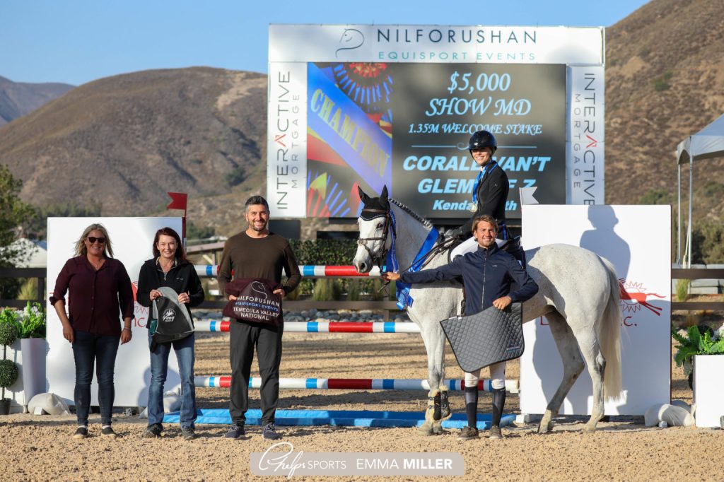 Temecula, California, USA – May 19, 2021 – Competitors descended upon the Grand Prix Arena at Nilforushan Equisport Events’ Temecula Valley National Week I to kick off three weeks of world-class jumper competition. 22 horse-and-rider pairs battled it out in hopes of claiming the premiere prize offering in Wednesday’s $5,000 1.35m Welcome Stake sponsored by ShowMD. Leaving the best for last was Kendall Gath (USA) and Corale Van’t Glemhof Z who swept in at the last minute to snag the blue ribbon.
