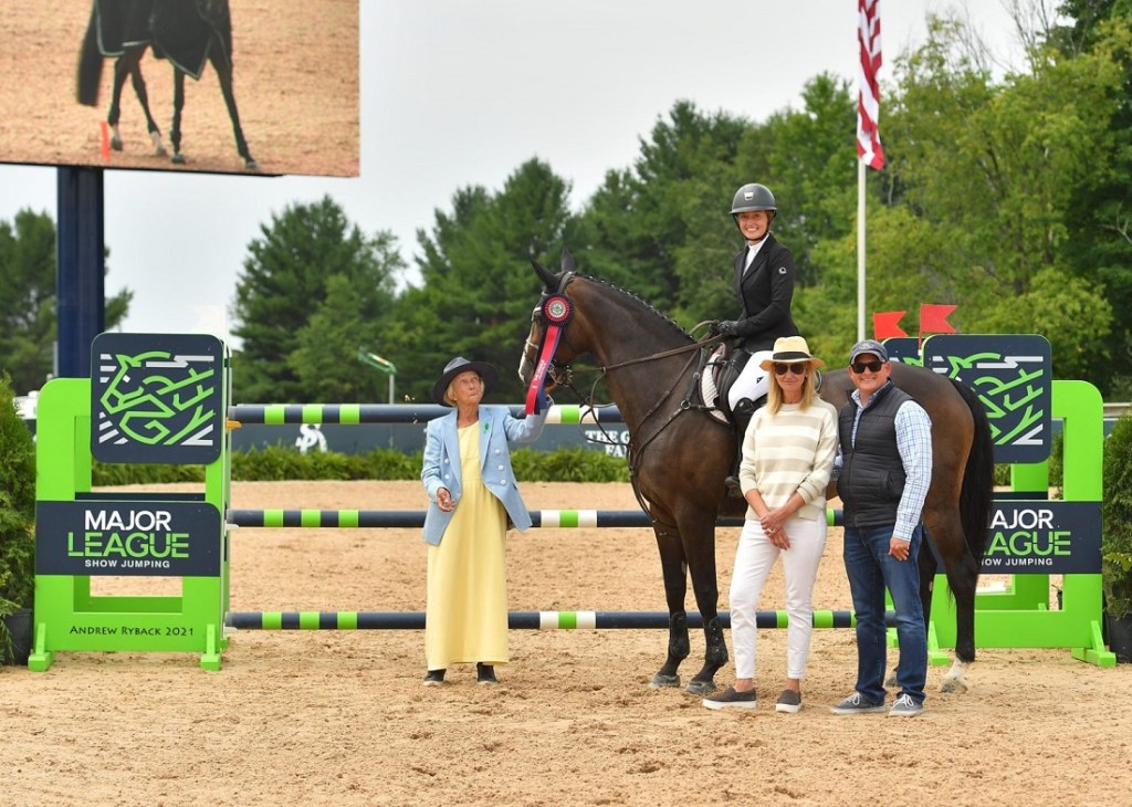 Traverse City, Michigan, USA – July 22, 2021 – Exciting Major League Show Jumping (MLSJ) competition during Week III of the Great Lakes Equestrian Festival (GLEF), presented by CaptiveOne Advisors, continued on Thursday. The inaugural MLSJ Tour, now underway with its second week of top-tier classes, will feature eight teams of six high-performance show jumping athletes from across the globe, and will offer over $6 million dollars in prize money throughout its ten events. The day’s highlight event in the Turtle Creek Casino & Hotel International Ring, the MLSJ $5,000 Groulx Family 1.40m Two-Phase CSI 2*, saw Great Britain’s Grace Debney (GRB) and Boheme De La Roque take home the top prize.