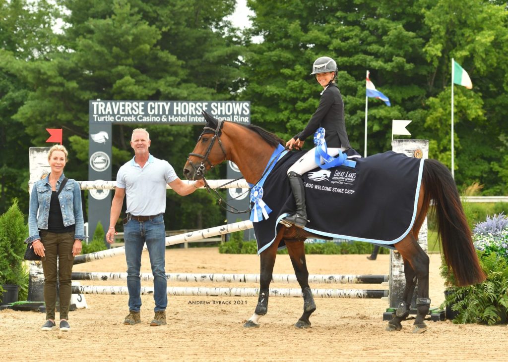 Traverse City, Michigan – August 06, 2021 – The penultimate day of CSI3* show jumping competition at the Great Lakes Equestrian Festival, presented by CaptiveOne Advisors, took the form of the $36,600 Welcome Stake CSI3*. A field of 54 talented international athletes entered the Turtle Creek Casino & Hotel International Ring hopeful to close out Friday with a win. After a competitive 14-horse jump-off, it was Bliss Heers (USA) and Antidote De Mars, owned by Bridgeside Farms LLC, to come out on top.