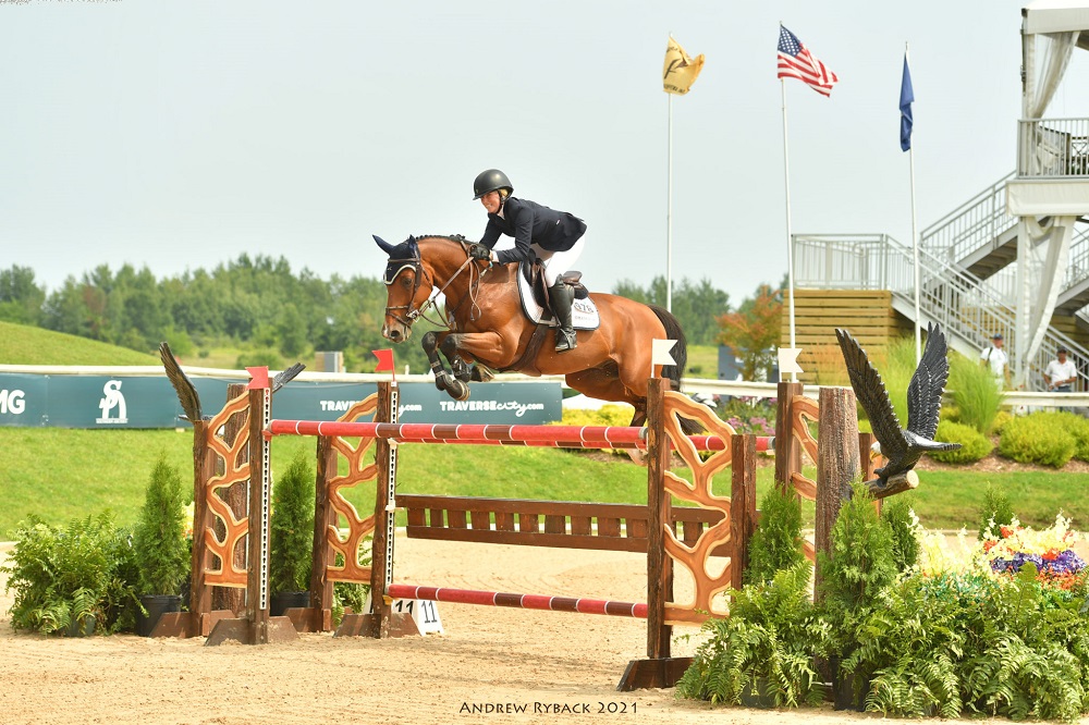 Traverse City, Michigan, USA – August 08, 2021 – Week V of the Great Lakes Equestrian Festival (GLEF), presented by CaptiveOne Advisors, came to a pinnacle Sunday, August 8, bringing international show jumping athletes back to the Flintfields Horse Park for another day of top sport. Taking center stage in the Turtle Creek Casino & Hotel International Ring, a field of 38 athletes representing nine countries would vie for the $137,000 Southern Arches Grand Prix CSI3* title. After two triumphant rounds, it was the United States’ Bliss Heers (USA) and Antidote de Mars who wore the blue rosette for the second time during Week V as they led the victory gallop.