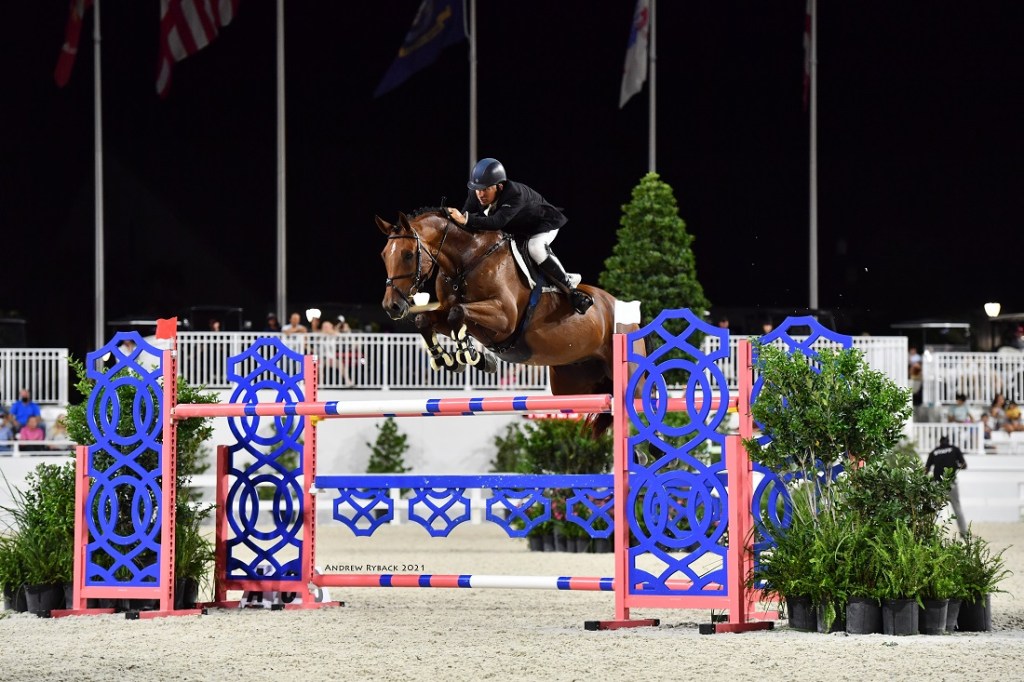 Ocala, Florida, USA – August 08, 2021 – An international list of competitors from 11 different countries took to the WEC Grand Arena Saturday night to contest the $75,000 Agricon Kubota Superstore Grand Prix. Doug Russell designed the winding track that featured a difficult triple combination that tested many riders throughout the night. Sixteen horse-and-rider combinations managed a clean first round and ten jumped double clear, but it was Aaron Vale (USA) and Thinks Like A Horse’s Prescott that snatched the win.