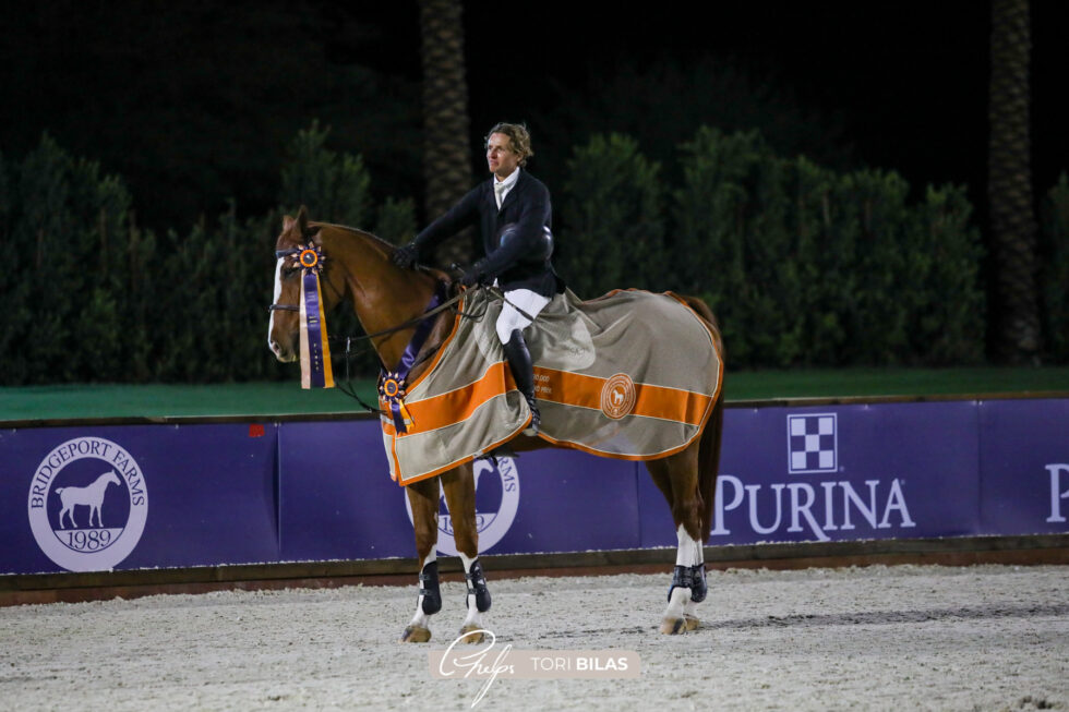Thermal, California – November 11, 2021 – Show jumping action at the Desert International Horse Park continued on Thursday during Week II of the National Sunshine Series. As the sun set over the desert, top athletes took to the Grand Prix Arena for the highlight event, the $30,000 FarmVet Grand Prix. The crowd gathered to watch as 65 entries took on the 1.50m first round. Just three entries managed to jump clear rounds, but only two jumped off, and ultimately it was Shawn Casady (USA) back in the winners circle as the sole double-clear effort with Cortechico to claim his second grand prix win in a row.