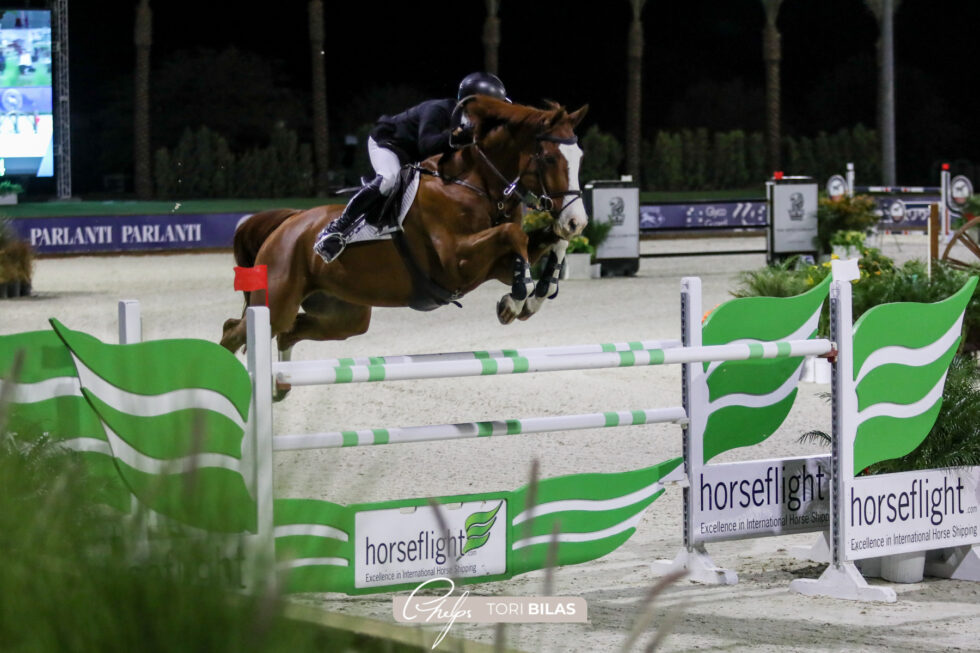 Jamie Taylor (USA) took an unfortunate fall off her second mount, Quatar, later in the order and subsequently withdrew from the second round of competition, leaving just Casady (USA) and Rivetti (BRA) to battle it out in the jump-off. First to take on the short track, Casady attacked the course with Cortechico’s massive stride and natural footspeed, not taking all the inside options but blazing around the turns to cover ground and make up time. Leaving all rails intact, he crossed the timers in 39.435 seconds, putting the pressure on Rivetti to improve upon his time with a clear round.