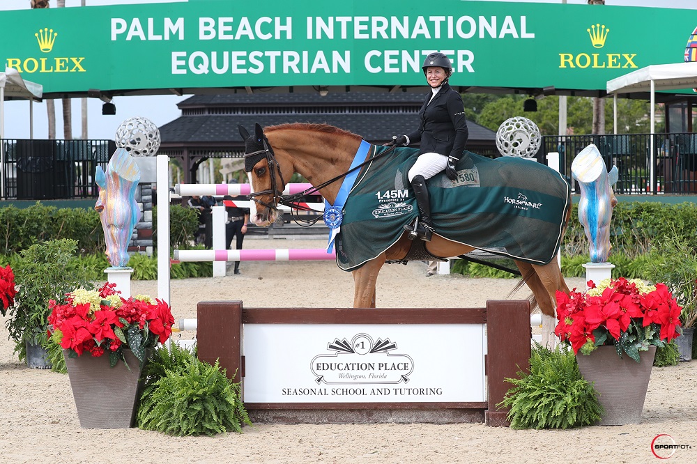 Wellington, Florida, USA – November 20, 2021 – The penultimate day of the ESP Pre-Charity CSI 3* horse show on Saturday offered jumper competitors their final chance to compete for FEI points ahead of the $137,000 NoltrexVet® Grand Prix CSI 3*, which will take place on Sunday as the highlight event of the competition. In the $37,000 #1 Education Place 1.50m CSI 3*, the final class of the day in the International Arena, Margie Engle (USA) and Jackofhearts, a 9-year-old Danish Warmblood gelding by Heartbeat x Baloubet du Rouet owned by Gladewinds Partners LLC, proved their prowess by finishing as the swiftest of only two double-clear pairs over designer Héctor Loyola’s (PUR) tracks to claim victory.