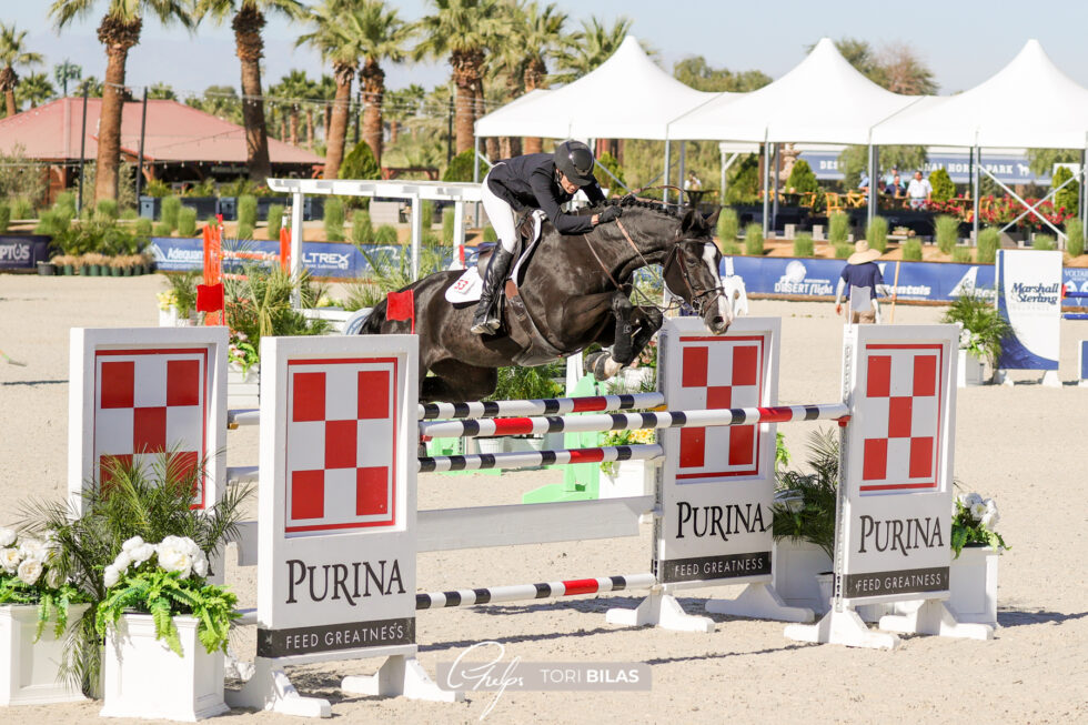 Thermal, California – December 02, 2021 – International competition began in the Grand Prix Arena Thursday at Desert Holiday I with the feature class of the day, the MLSJ $9,100 1.40m Two Phase CSI2*, sponsored by Desert Flight. Ireland’s Alan Wade (IRL) set the track for the 33 entries, which included bending lines, rollback turns, a vertical-oxer double combination, and an oxer-vertical double combination. After jump seven, the jump-off portion of the class began, so riders thoughtfully executed their first seven fences before taking the speed up a notch and racing towards home while also trying to keep the rails from falling. While many top international riders completed both phases fault-free with competitive times, it was Israel’s Ashlee Bond (ISR) and Lazy who crossed the beams in the quickest time to secure victory.
