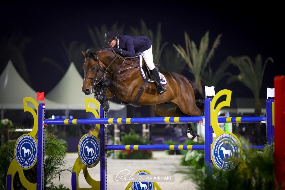 Egypt’s Nayel Nassar (EGY), on a roll in CSI2* competition during Desert Holiday, came into the ring on Igor van de Wittemoere with a vengeance after his third place finish in the $72,900 Welcome CSI 5*. He expertly maneuvered around the course in 34.77 seconds, the fastest at this point, but lowered the vertical coming out of the remaining combination for a score of 4 faults. Ireland captured the lead as Jordan Coyle (IRL) and Ariso managed the track fault-free in an ultimately unbeatable time of 34.49 seconds, with just four entries left to challenge him.