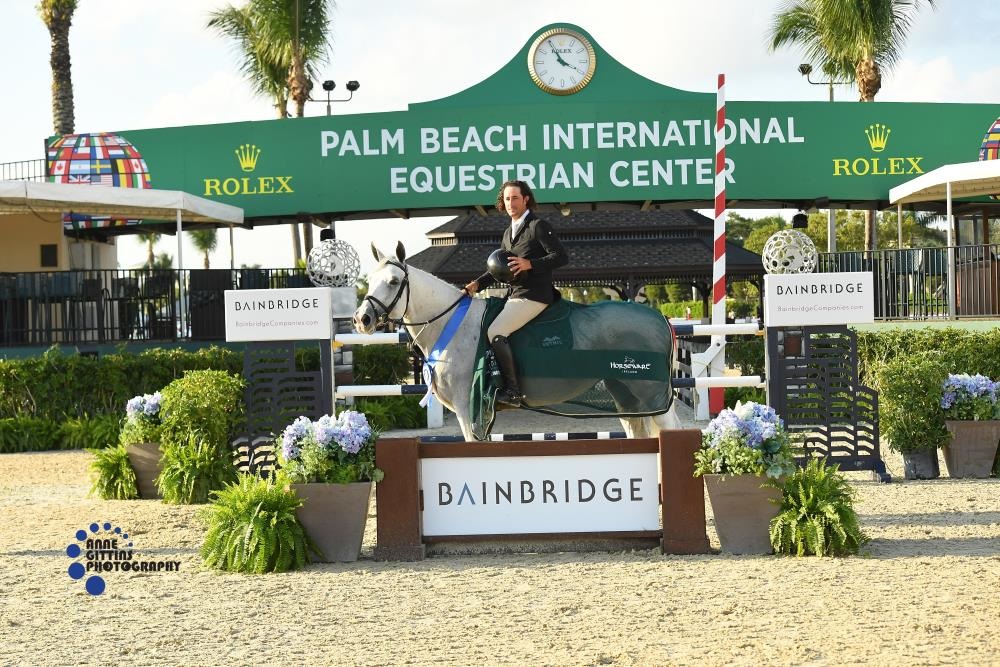 Wellington, Florida, USA – December 10, 2021 – Forty-two entries competed in the $10,000 Bainbridge Companies 1.40m Open Stake on Friday, and exactly one-quarter of the class advanced to the jump-off, which saw 13 pairs jump the second track. Six pairs finished the contest double-clear, led by Nicholas Dello Joio (USA) on Jessica Mendoza’s Diamants Aurora. The duo edged ahead of the field by fractions of a second, crossing the finish line without penalties in 39.88 seconds to take the win.