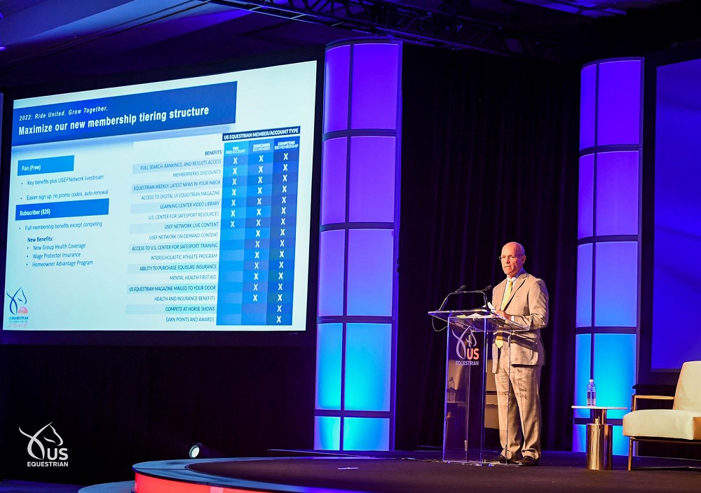 Naples, Florida – January 15, 2022 – US Equestrian President Tom O’Mara and CEO Bill Moroney delivered the General Session presentation to members and staff on January 14 at the US Equestrian Annual Meeting in Naples, Fla. They looked back at the successes and improvements made by US Equestrian in 2021 and laid out three priorities for 2022 with the theme of Ride United. Grow Together. US Equestrian senior staff also provided updates on 2021 and what is ahead in 2022.