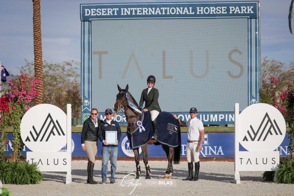 Thermal, California, USA – January 28, 2022 – International athletes took over the Grand Prix Arena again Friday afternoon at the Desert International Horse Park (DIHP) for the $36,600 Talus Speed 1.50m CSI 3*, set over a course designed by Mexico’s Manuel Esparza. Forty-one entries tested the speed track one by one, testing their gears and attempting to overtake the lead as the quickest fault-free round. In the end it was Lindsay Archer (USA) aboard Jarpur who stole the spotlight with a blazing fast clear round that couldn’t be caught.the United States’ Lindsay Archer and Rhys Farms, LLC’s Jarupur to come out on top.