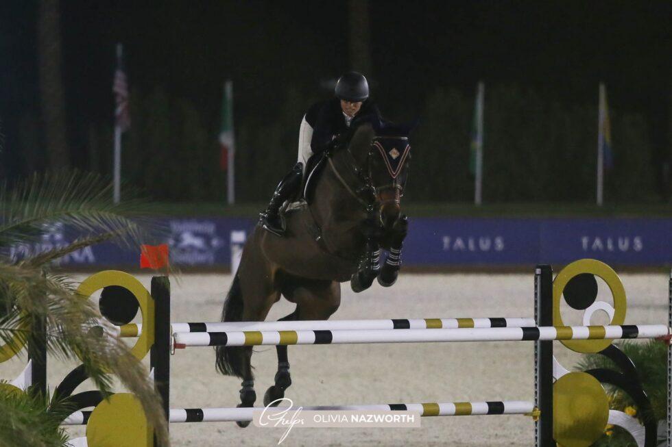 Thermal, California, USA – February 12, 2022 – All eyes fell on the Grand Prix Arena Saturday night of Desert Circuit IV as top show jumping athletes competed for top honors in the $40,000 Adequan Grand Prix. Under the lights and in front of an impressive crowd at Desert International Horse Park, horse-and-rider combinations tried one by one to navigate the course fault free in order to secure a spot in the subsequent jump-off. At the conclusion of the prestigious class, it was Canada’s Ben Asselin (CAN) on top aboard Veyron, owned by Attache Stables.
