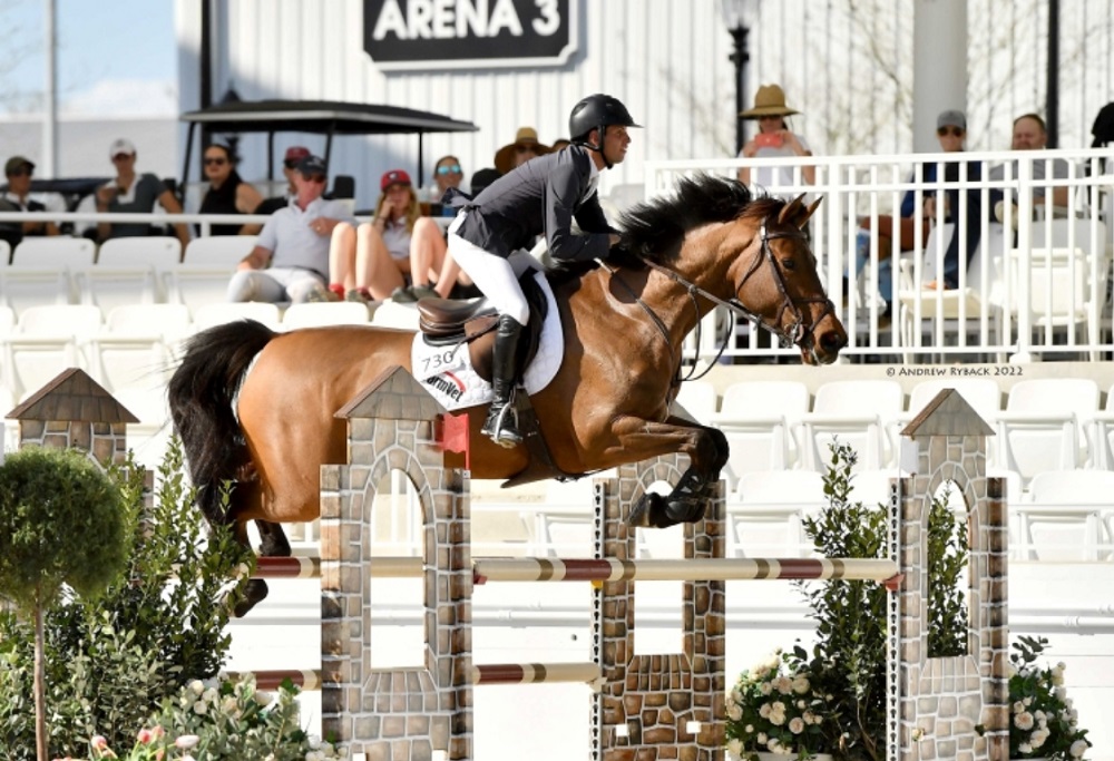 Ocala, Florida, USA – February 24, 2022 – The 2022 Winter Spectacular Show Series is in full swing with thrilling competition each week. Feature class action during Week VIII kicked off with 24 horse-and-rider combinations competing for the win in the $20,000 C. Jarvis Insurance Welcome Prix. FEI Level II course designer Colm Quinn (IRL) designed the winding tracks that allowed six competitive entries to produce clean first rounds. Out of the six, only two managed to be double clear, but it was Adam Sklansky (USA) and Ellen Walker’s Hakini (Nemero Uno x Bieke) that scored the ultimate victory.
