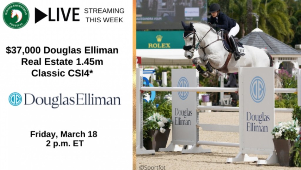 Wellington, Florida, USA – March 18, 2022 – It’s showtime for showjumping during the tenth week of the 2022 Winter Equestrian Festival (WEF) at the Palm Beach International Equestrian Center (PBIEC) and the $35,000 Douglas Elliman Real Estate CSI 4*, today starting at 2:00 PM local time. Please click on the link below or image above to have direct acess to the live streaming feed of this challenge at Wellington. Enjoy!