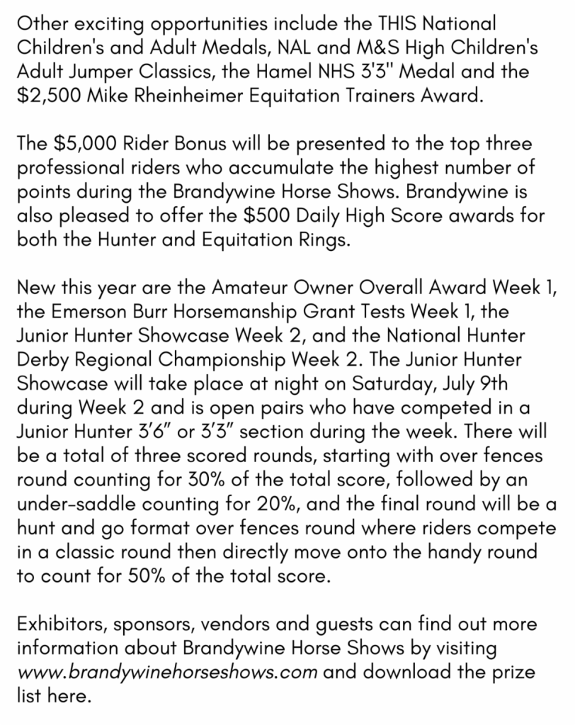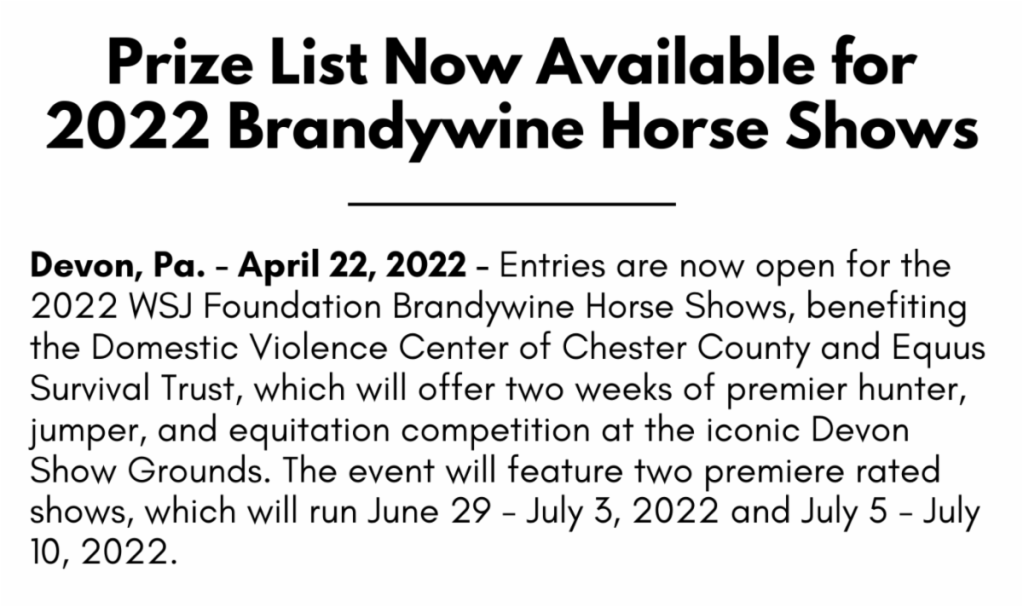 Source: Press Release by Cassidy Klein / Phelps Media Group Inc for Brandywine Horse Shows / WSJ Foundation