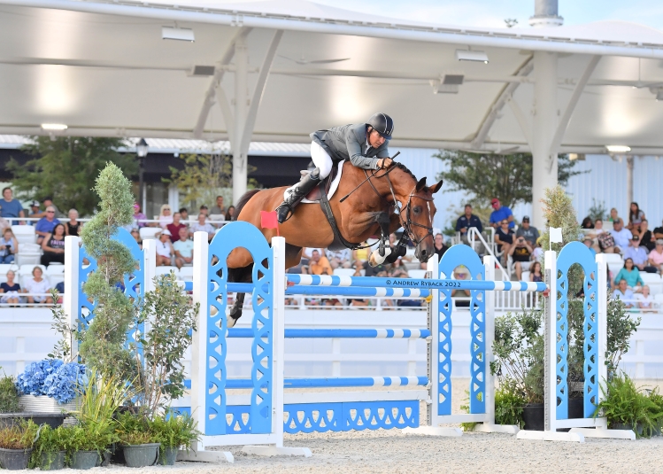 William Simpson received the fastest four-faulter award aboard his own Chacco P in the $100,000 UF Health National Grand Prix with a very quick time of 75.567 seconds, with one rail down.