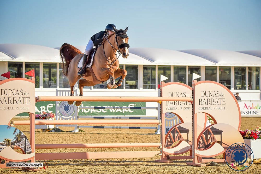 In this 1.45 (FT) class, Fuchs rode the lovely, nine year-old mare, Che Tipa (Caseo Della Caccia x ‘Ogano Sitte) who he has been building up over the past week and is owned by Willow Grace Farms. Paris had more than one reason to celebrate this win, coming in just behind, to take second, was another one of Willow Grace Farms’ horses, the 14-year-old mare, who has won many a rosette here at Montenmedio. She rode Anna Jo (‘Acodetto 2’ x ‘For Pleasure’) towards second-place, backed by a penalty-free performance in 68.98 seconds.