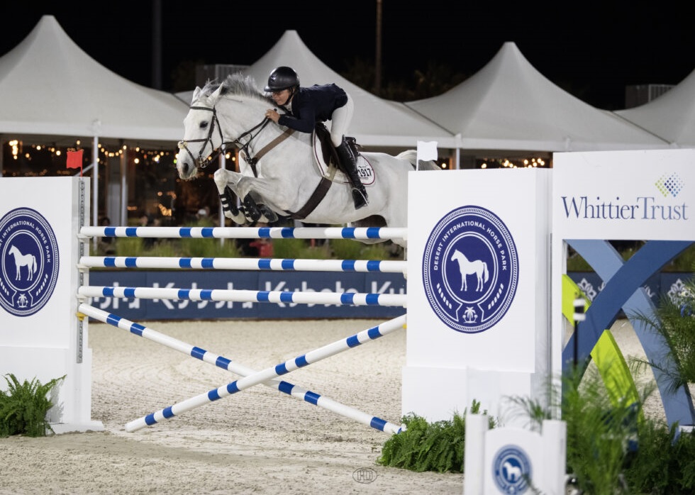Thermal, California, USA – February 03, 2023 –The night fell and the stage was set for the inaugural $15,000 Whittier Trust 6-Bar. Beginning at 1.35m, nine horses jumped and attempted to keep all the rails up, as the fences got higher and higher. In round one, all but one pair jumped the six 1.35m fences clear. The fences were raised to 1.50m and the field got slightly thinner, but it was still apparent there was more jumping to come. At the 1.60m height, four horses jumped clear: Kyle King (USA) with Chess, Kaitlin Campbell (USA) with Emir, Michelle Berry (USA) with Ilyas van de Mispelaere, and Skylar Wireman (USA) with Karen!.