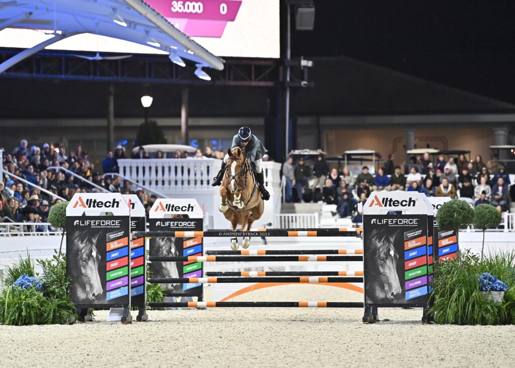 Ocala, Florida, USA – February 04, 2023 –It was standing room only at World Equestrian Center – Ocala for the $100,000 Alltech Grand Prix during week V of the 2023 Winter Spectacular Show Series. The night culminated with local fan-favorite Aaron Vale (USA) piloting Alise Carrico and Thinks Like A Horse’s Cristo Beech (Its The Business x Ragua) to the horse’s very first Saturday night grand prix win at World Equestrian Center – Ocala.