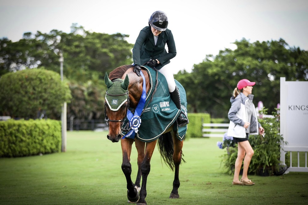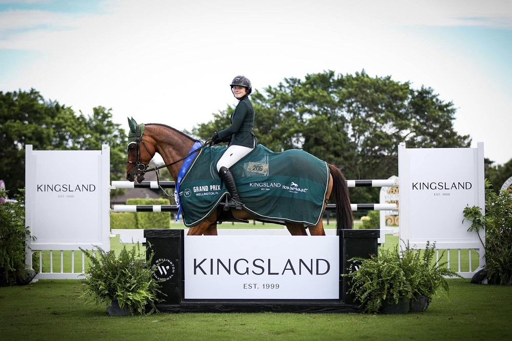 Wellington, Florida, USA — June 04, 2023 — The $10,000 Kingsland Equestrian 1.40m Stake took place Sunday to round out June I as the feature class of the weekend. Thirteen competitors took to the course, designed by Andy Christiansen (ECU), with three riders returning for the jump-off. Gwyneth Babington (USA) and Mark Q, owned by Kevin Babington and Deirdre Bourns, emerged victorious to take home the blue ribbon.