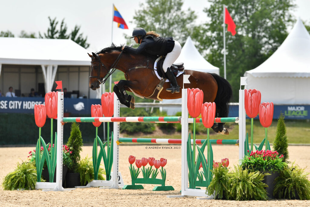 Traverse City, Michigan, USA – June 21, 2023 – The Markel/USHJA Platinum Jumper Championships for Zones 1, 2, 5, and 6 kicked off Wednesday of Traverse City Spring III, the final week of the Traverse City Spring Series, presented by Turtle Creek Casino & Hotel. There were two big winners of the day, with Lisa Goldman-Smolen capturing the win riding Sovereign in the 1.40-1.45m section, and Rylynn Conway taking the top prize on Escada in the 1.30-1.35m division.