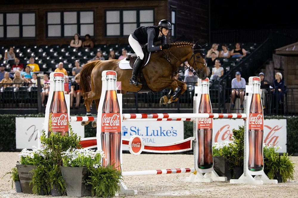 While the official theme of the evening was “Red, White, and Bluegrass” – honoring the venue’s upcoming music festival to be hosted September 1-3, 2023 – as competition unfolded it became a contest between the leading ladies. All five of the clear rounds presented by Stuller Power Solutions in the first round featured horses piloted by women, with the top seven consecutive placings claimed by female riders from a class of 19 entries.