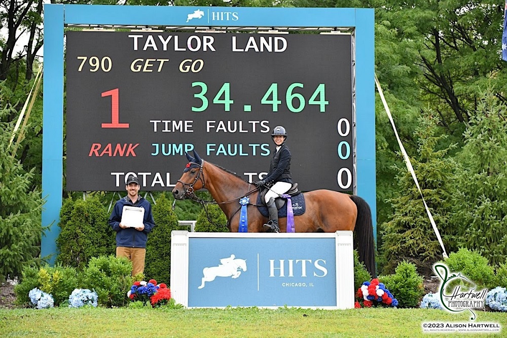 Wayne, Illinois, USA – August 11, 2023 – Spectators gathered at the Douglas Elliman Grand Prix Stadium as show jumping returned to Hits Chicago during the $25,000 Hits Grand Prix on Friday morning. Riding to the top of the podium during the third week of the Lamplight Equifest was Taylor Land (USA) with her mount, Get Go, being one of four producing a double clear round across the field. Holly Shepherd (USA) and H J Hercules sped to second as the fastest combination, while Natalie Jayne (USA) and Boheme du Moulin rounded out the top three.