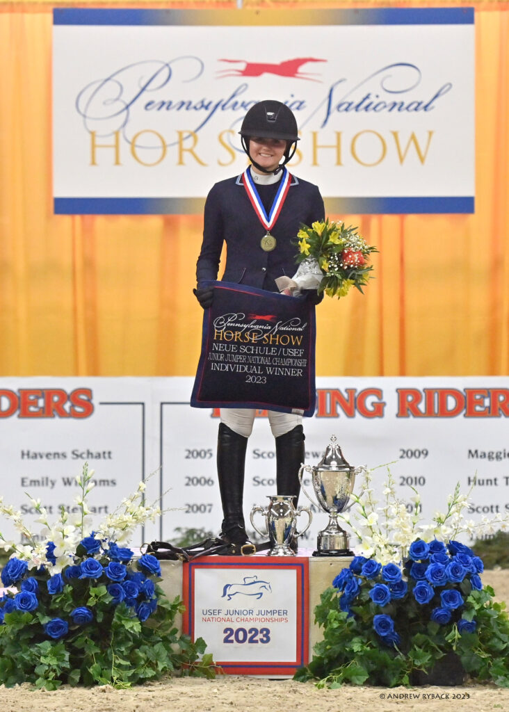 Harrisburg, Pennsylvania, USA – October 15, 2023 – Coming into Saturday night’s third and final phase of the USEF Junior Jumper National Championship at the Pennsylvania National Horse Show, Sofia Cady (USA) felt that she had little to no shot at a podium finish. However, as the rails fell for each of the top five, a clear round from Cady and her mount, Deleyn, took them straight to the top of the leaderboard for the gold medal win.