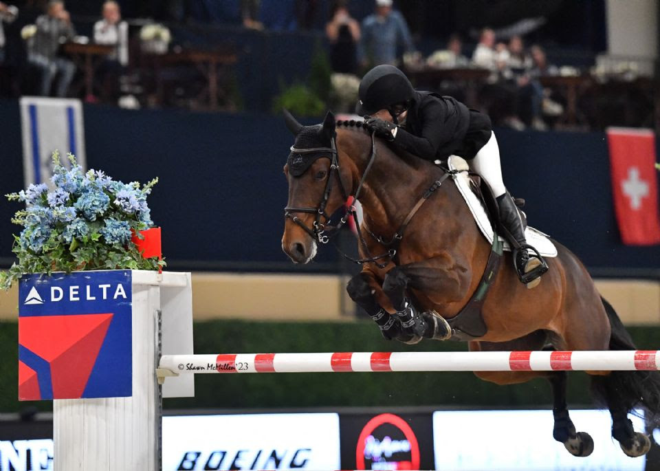 Upper Marlboro, Maryland, USA – 27, 2023 – Katherine “Katie” Dinan (USA) joined her trainer, the Swiss Olympic team silver medalist Beat Mändli (SUI), on the podium on Friday at the 2023 Washington International Horse Show (WIHS), presented by MARS Equestrian™. Riding Atika des Hauts Vents, she finished third in the $78,000 Speed Final CSI 5*, capping off the exciting Military Night, presented by Boeing.
