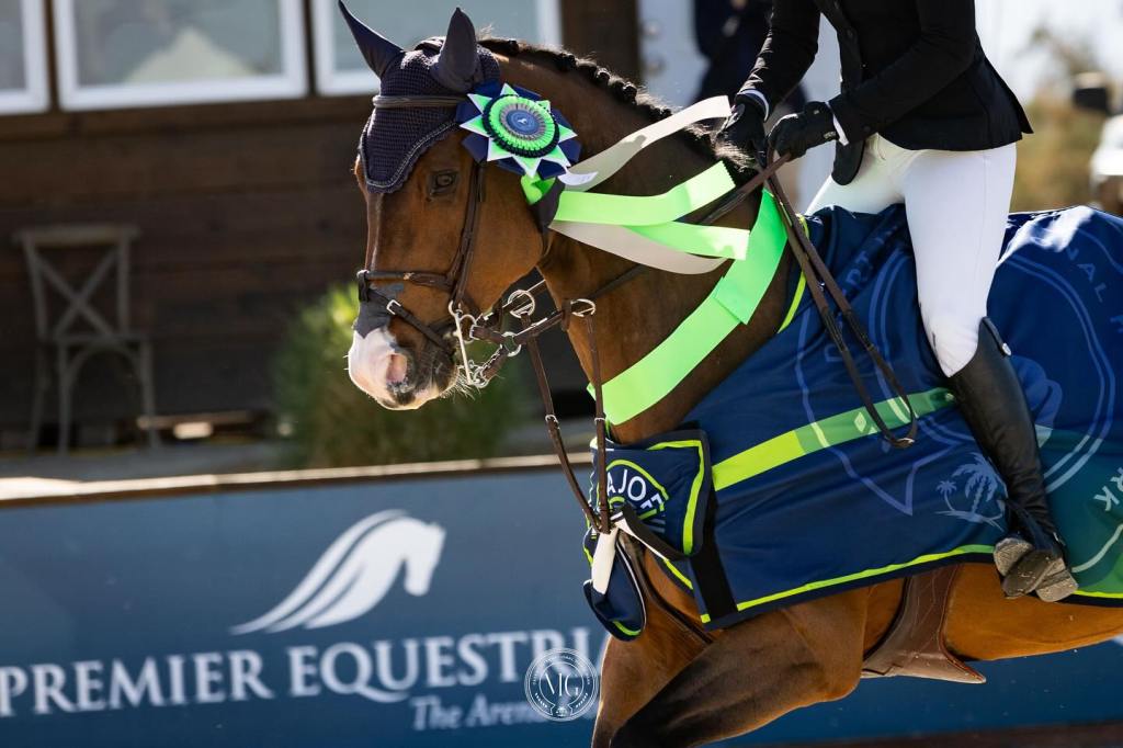 Thermal, California, USA – December 02, 2023 – Some riders would be intimidated knowing Conor Swail (IRL) was following them as the final rider to go in a 12-horse jump-off, but not Elisa Broz (USA). Broz and Tinkerbell, owned by Hidalgo, put in a blazing fast round in Friday’s $76,000 Premier Equestrian Grand Prix CSI 2* to make Swail catch her, and he was unsuccessful, pulling a rail in his effort and awarding the win to Broz, just 20.