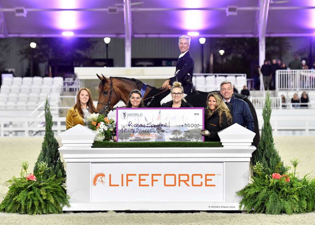 Ocala, Florida, USA – January 20, 2024 – A unseasonable chilly Florida night didn’t keep the spectators from gathering at the WEC Grand Arena for the highlight event of the week, the $100,000 Lifeforce Grand Prix. FEI Level III course designer Anderson Lima (BRA) set the challenging track for a field of the world’s best athletes. In a nail-biting four-horse jump-off, Richard Spooner (USA) guided Molly Ohrstrom’s Halcon (Con Air 7 x Jota-e Calista), a nine-year-old Argentinian Sport Horse stallion, not only to his inaugural Saturday night grand prix but also to a triumphant victory.