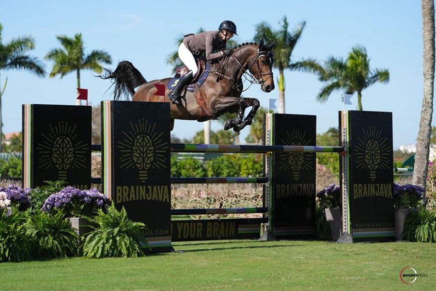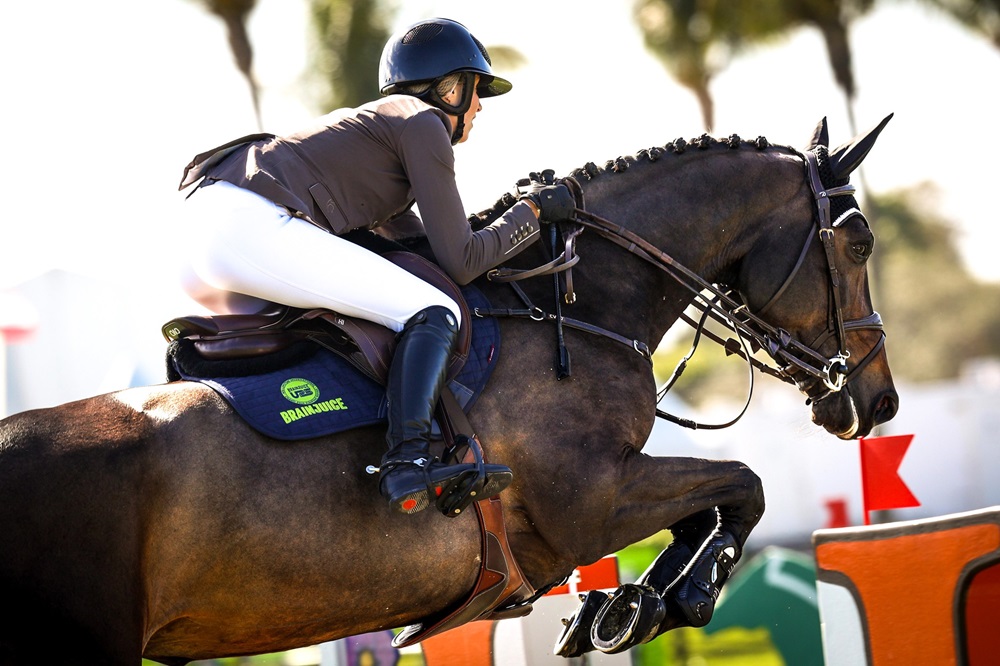 Wellington, Florida, USA – January 21, 2024 – The second week of the 2024 Winter Equestrian Festival (WEF) at Wellington International came to a peak on the Equestrian Village derby field on Sunday. Competition on the derby field first began with the $31,020 BrainJuice Grand Prix CSI U-25 as 60 entries vied for top call in the first under 25 event of the season. Ultimately, the blazing fast combination of Natalie Dean (USA) and Dotcom D’Authuit bested the field of 14 jump-off contenders.