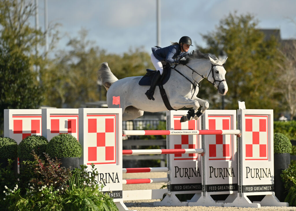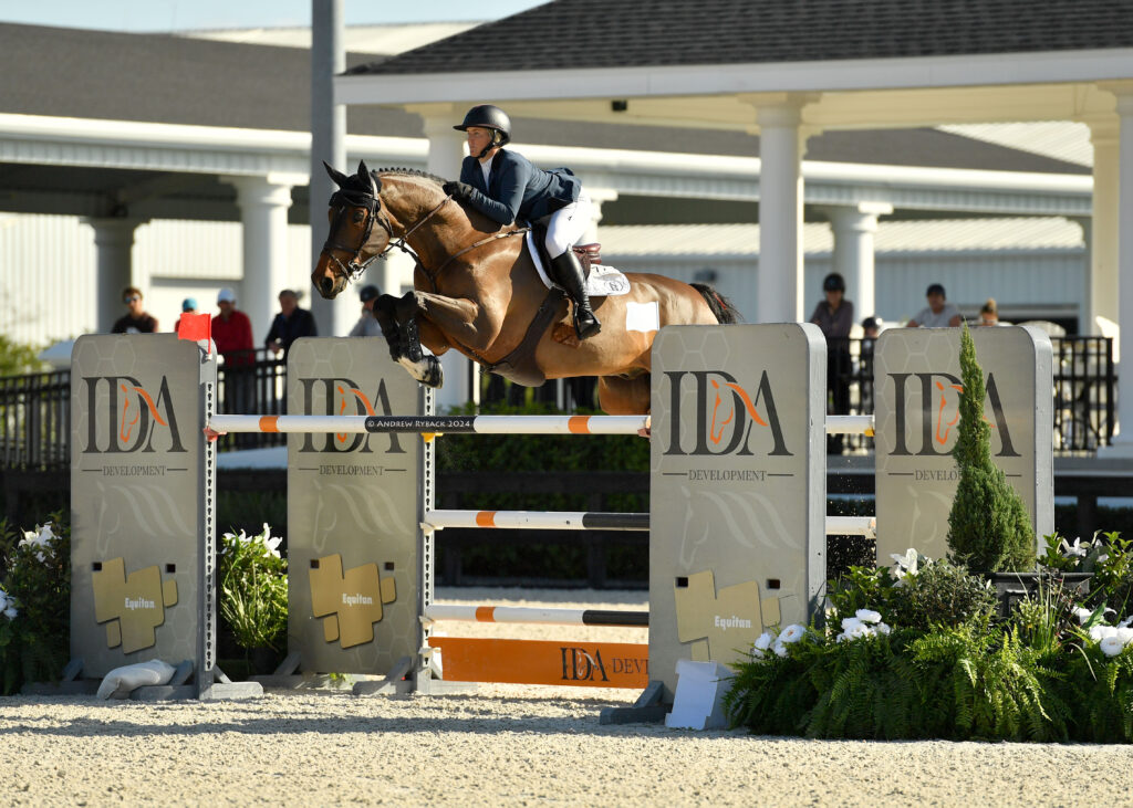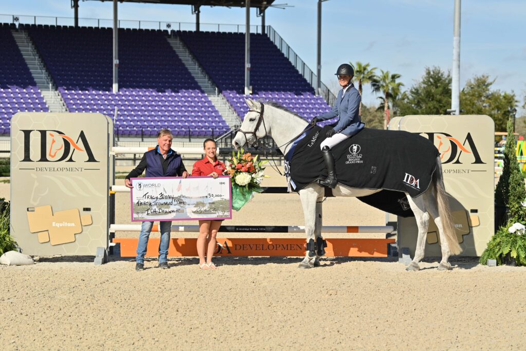 Ocala, Florida, USA – February 11, 2024 – A beautiful sunny Florida day set the scene for the $100,000 IDA Development Grand Prix. An elite field of athletes representing 10 different nations gathered at the WEC Stadium early this morning to compete for the winning title over a challenging track set by FEI Level III course designer Joey Rycroft (CAN). In a three-horse jump-off, the dynamic duo of Tracy Fenney (USA) and MTM Farm’s MTM Apple (Favorit Ask x Kong’s Whipsie) seized the lead with a speedy performance, finishing nearly three seconds ahead of second place.