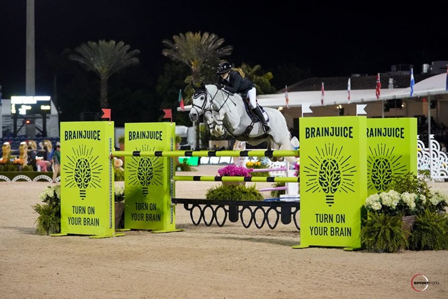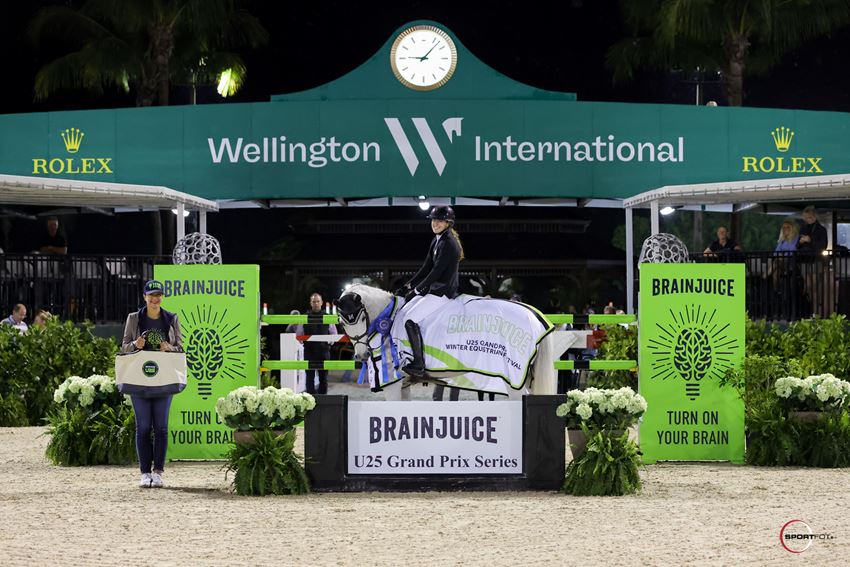 Wellington, Florida, USA – March 01, 2024 – The BrainJuice Under 25 series returned to Wellington International during Week 8 of the 2024 Winter Equestrian Festival (WEF). Under the lights of the International Arena, the penultimate competition of the series welcomed fifty of the season’s best young riders to the $32,000 BrainJuice U25 Semi-Final Grand Prix. The course tested the young riders once again ahead of the series final to be held during WEF 10.