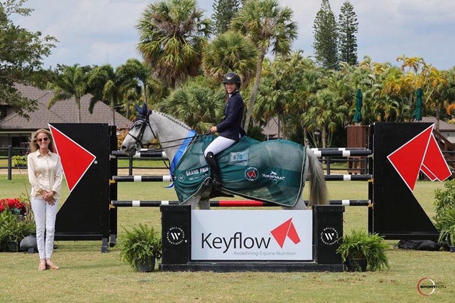 Wellington, Florida, USA – April 21, 2024 – Closing out a super Sunday on the field of the Equestrian Village at Wellington International, Rebecca Conway (USA) won the $35,000 Keyflow Feeds USA Grand Prix aboard Con Coleur for owner Blue Hill Farm.