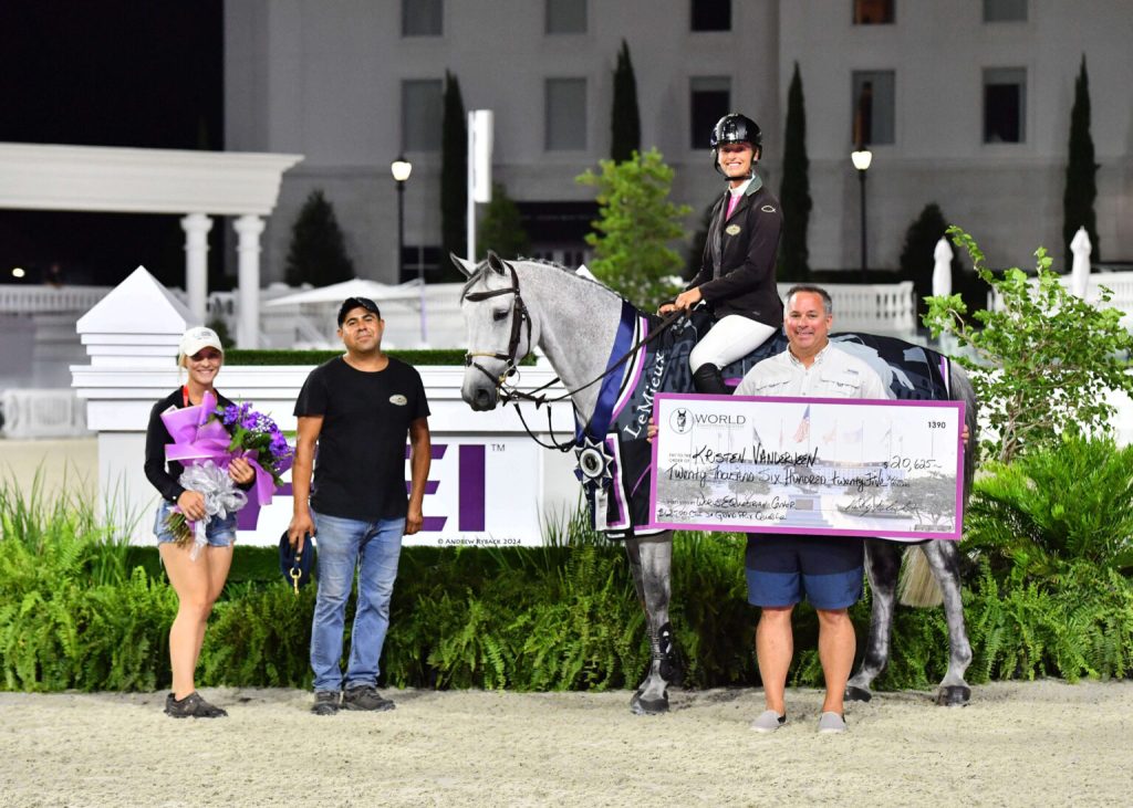 Ocala, Florida, USA – June 20, 2024 – A perfect Florida night set the stage for the $62,500 Grand Prix Qualifier CSI 3*, featuring 42 top Jumping combinations from 13 nations. FEI Level IV course designer, Guilherme Jorge (BRA), crafted the winding tracks for the tonight’s qualifier which culminated in an exciting 13-horse jump-off. Kristen Vanderveen (USA) and Bull Run Jumpers, Inc.’s Bull Run’s Hesed (Christian 25 x Lord Z) clinched victory by a mere tenth of a second.