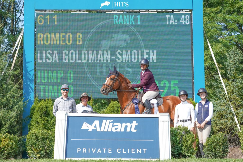 Wayne, Illinois – August 08, 2024 – The $35,000 SummitMax Grand Prix was not the only highlight during the action-packed week at Hits Chicago. On Thursday, August 8, the $20,000 Alliant Private Client Cup took center stage. Lisa Goldman-Smolen (USA) of Red Coat Farm skillfully guided Romeo B, her own seven-year-old Belgian Warmblood stallion by Heartbreaker, to a first-place finish in the feature class of the day backed by a double-clear round and a jump-off time of 34.025 seconds.