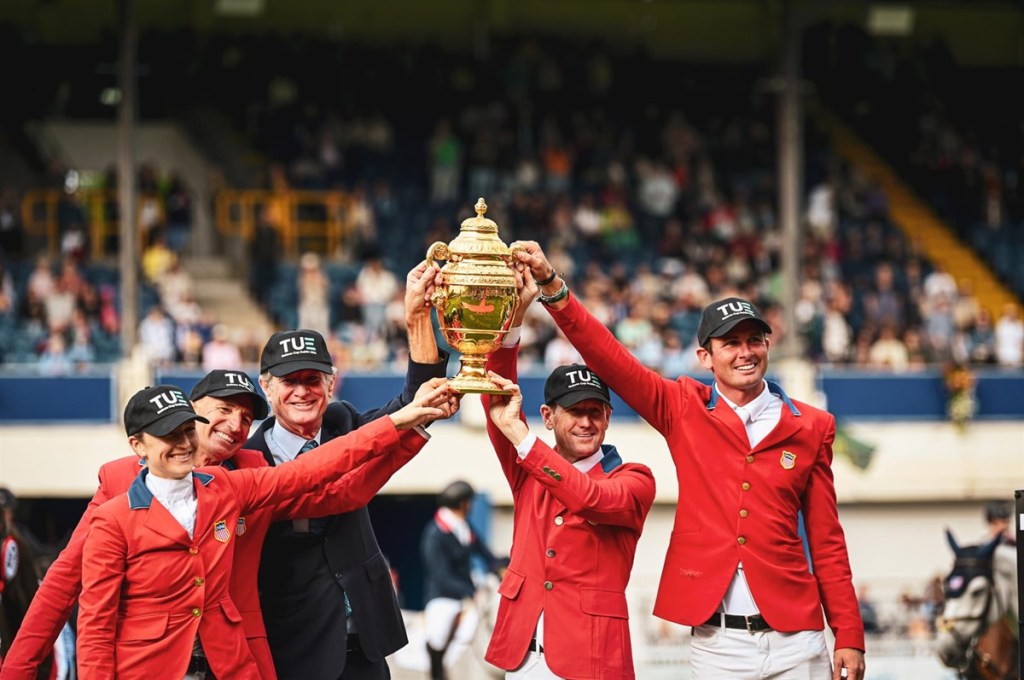 Dublin, Ireland – August 15, 2024 – The NetJets U.S. Jumping Team excitedly stepped to the top of the podium at the conclusion of the FEI Jumping Nations Cup of Ireland CSIO 5* for the Aga Khan Trophy, producing a strong team score in both rounds of competition to take first place overall. The team finished on a final team total of four penalty-points, while Ireland finished in second on eight, and Great Britain in third on team total of 12. This is the U.S. Jumping Team’s third win in the FEI Jumping Nations Cup of Ireland CSIO 5* and their first victory in Dublin since 2017.