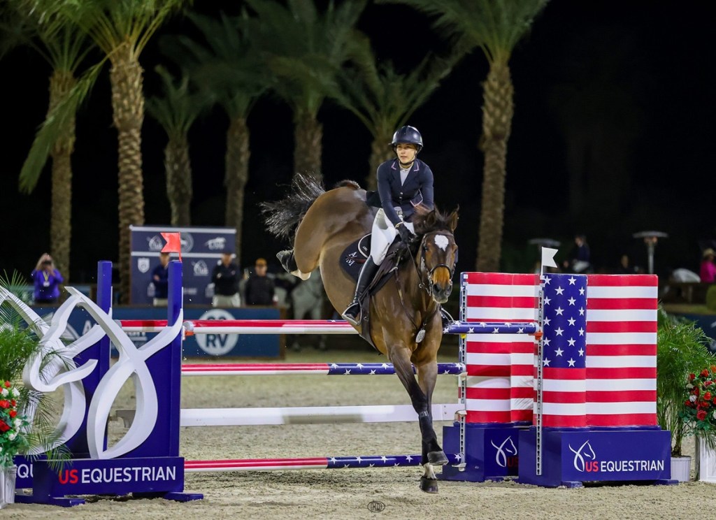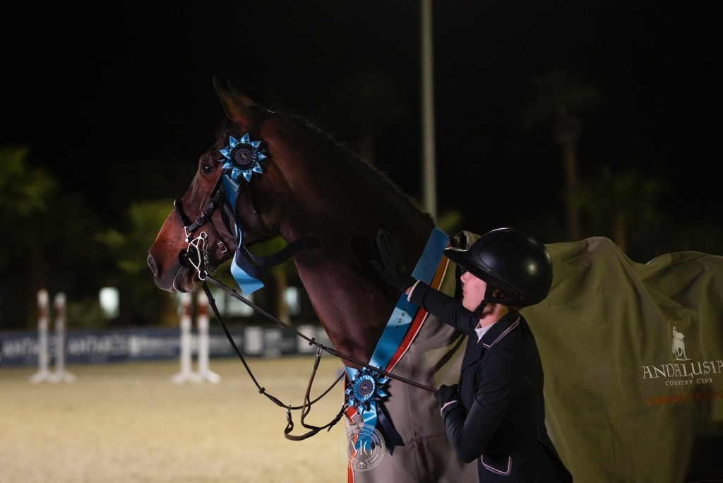 Thermal, California, USA – November 06, 2024 – Amanda Gomez (USA) has consistently proven that she and Charly-Ann are ones to watch in speed classes at the Desert International Horse Park, and the duo demonstrated that again on Wednesday evening, November 6 during National Sunshine Series 2. From a field of 65 entries, Gomez and Charly-Ann topped the $10,000 Andalusia Country Club 1.35m Welcome Speed by a margin of more than a second.