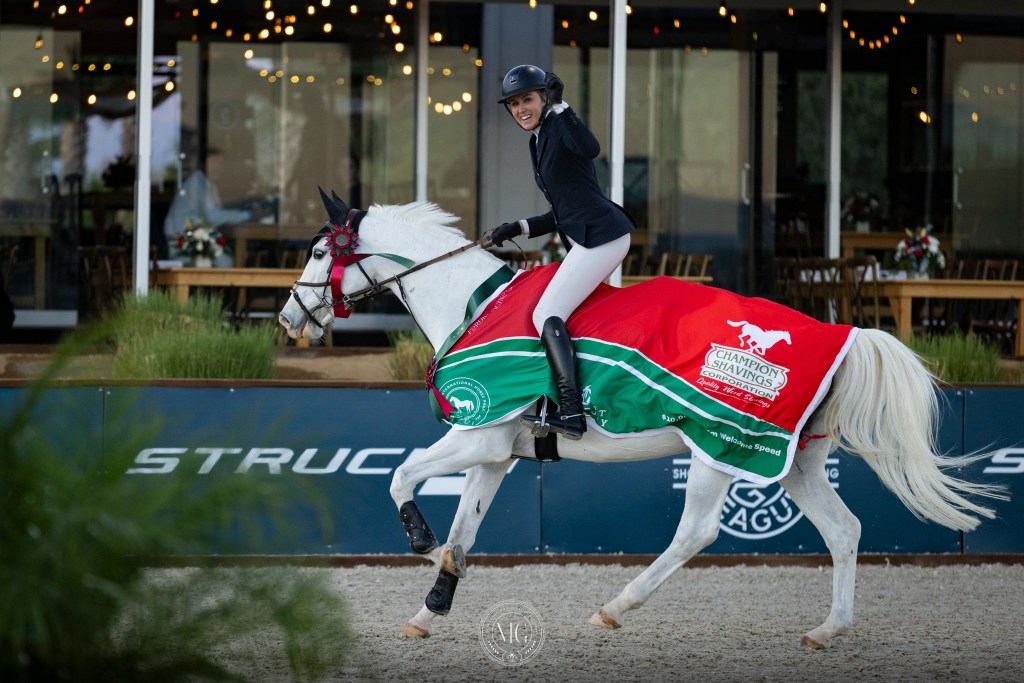 Thermal, California, USA – December 4, 2024 – Jamie Sailor (USA) and Fire Flash Toltien have consistently shown that they are tough to beat at the 1.35m height, and on Wednesday, December 4, at the Desert International Horse Park, that proved to be the case again. While 97 other entries tried, no one could catch Sailor and “Willow,” earning the pair the win in the $10,000 Welcome Speed 1.35m, sponsored by Champion Shavings.