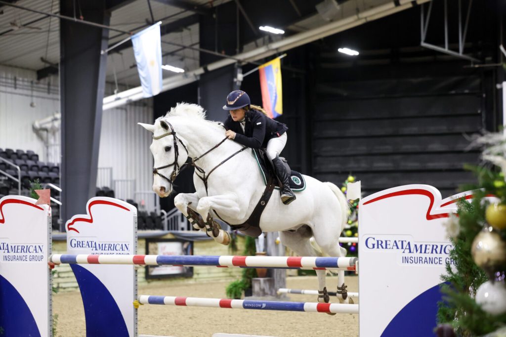 Wilmington, Ohio – December 21, 2024 – The crowd in the Standlee Sanctuary went quiet Saturday evening as Sarah Meier (USA) entered for the jump-off in the $30,000 Grand Prix of Christmas in the Midwest. Bobby Murphy (USA) designed the final track for 15 athletes that allowed only five to return for the tie breaker.