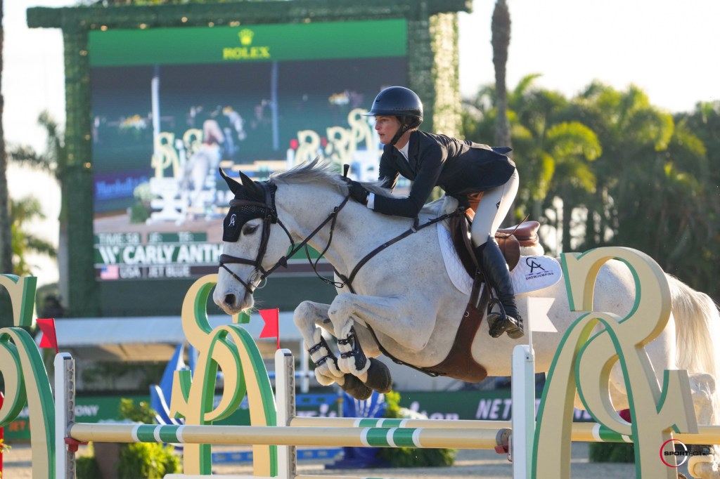 Wellington, Florida, USA – January 10, 2025 – To open competition in the International Arena Friday morning, Carly Anthony (USA) took the top placing with Jet Blue, owned by Portfolio Horses, in the Bainbridge Speed Challenge – 1.40m. Anthony and the 14-year-old Dutch Warmblood gelding (VDL Zirocco Blue x Indoctro) sped around the speed course in 66.994 seconds, earning the win at the Wellington International venue.