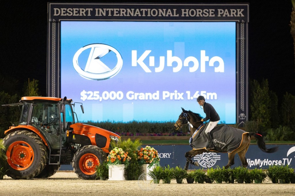 Thermal, California, USA – January 11, 2025 – Kyle King (USA) wanted to utilize Saturday night’s $25,000 Kubota Grand Prix as a nice and easy confidence builder for his top mount Odysseus, but when it came time for the jump-off, King decided he couldn’t just take it nice and easy. Instead, he went for it, earning the win in the Desert Circuit 1 featured class by more than three seconds.