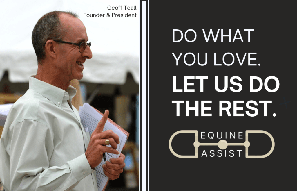 With Equine Assist, Geoff Teall, a household name in the equestrian industry, is making his expertise available in an affordable, accessible, and convenient format. Equine Assist works with all levels of equine businesses, including new ventures, to help maximize efficiency, client satisfaction, and professional success. Whether you find yourself running out of hours in the day to handle your administrative tasks, need creative solutions to make your daily operations more efficient, or want expert-level consulting to make your equestrian business or event shine, Equine Assist is here to help.