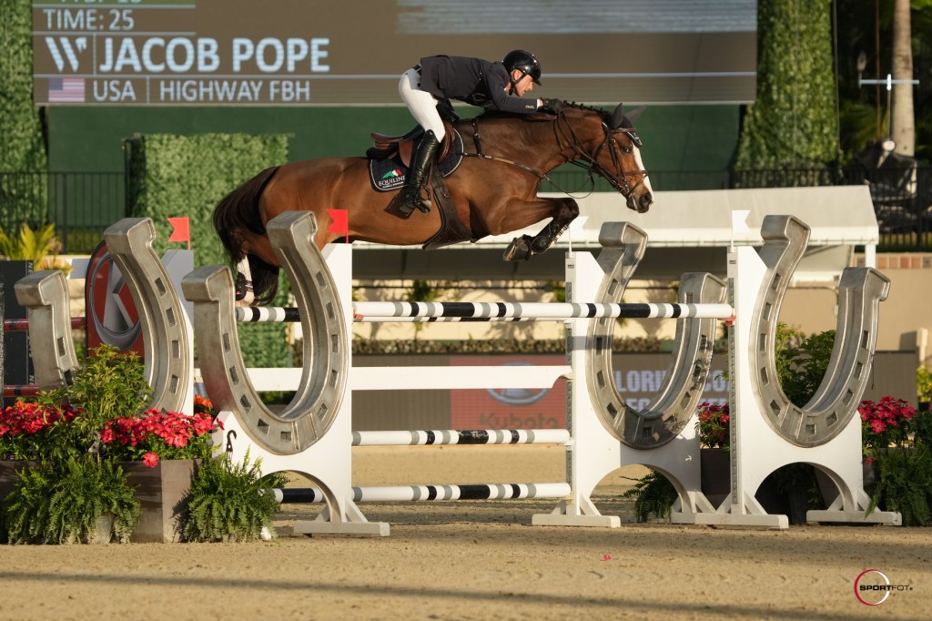 Wellington, Florida, USA – January 26, 2025 – Jacob Pope (USA) wasn’t short of good luck charms on Sunday with his parents and barn family supporting him ringside. Highlighting the final day of Week 3 at the Winter Equestrian Festival (WEF), presented by NetJets, Pope topped the $62,500 Florida Coast Equipment Grand Prix CSI 2* with Highway FBH, owned by Sherri Crawford. Highlighted by 12 weeks of consecutive FEI competition, WEF continues through March 30 at Wellington International in Wellington, Florida, USA.