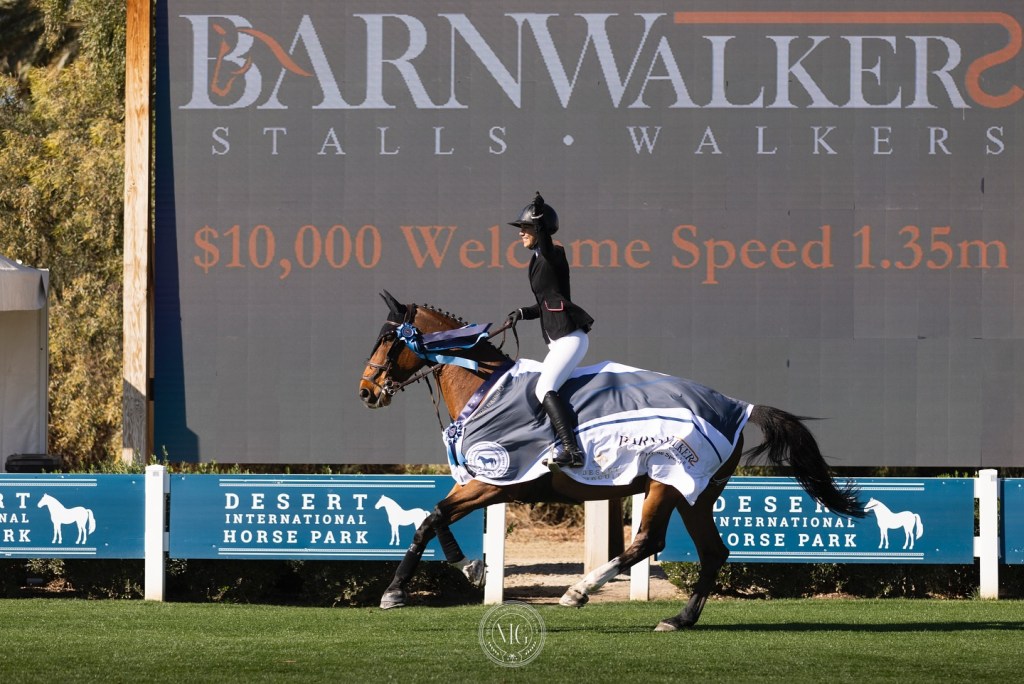 Thermal, California, USA – February 05, 2025 – Amanda Gomez (USA) and Charly-Ann are no strangers to winning in the Desert International Horse Park’s Grand Prix Arena, but on Wednesday, February 5, the pair proved that their speed stays consistent no matter the surface. With a time of 62.390 seconds, Gomez and Charly-Ann raced to victory in the $10,000 Barnwalkers Welcome Speed, held on the DIHP Grass Field at Desert Circuit 5, presented by Fobi.