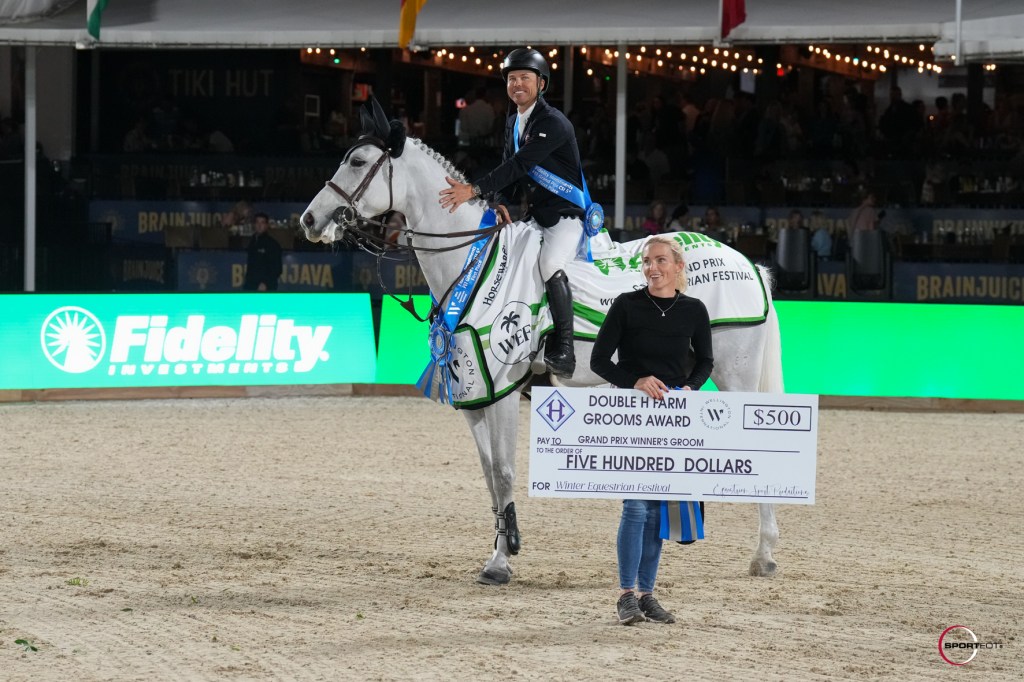 Wellington, Florida, USA – February 08, 2025 – World no. 3 Kent Farrington stormed to a five-star victory on home ground in the $385,000 Fidelity Investments® Grand Prix CSI 5* aboard his 2024 FEI World Cup™ Final partner Greya in the Wellington International stadium during the Winter Equestrian Festival’s (WEF) ‘Saturday Night Lights’. Highlighted by 12 weeks of consecutive FEI competition and four five-stars, WEF continues through March 30 in Wellington, Florida, USA.