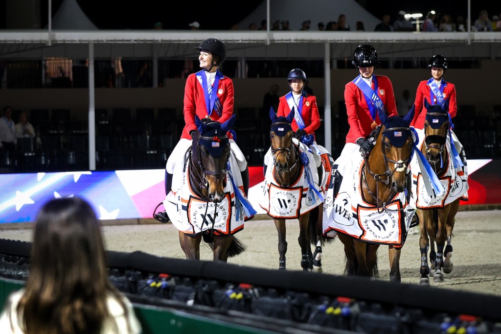 Wellington, Florida, United States – March 01, 2025 – The U.S. Jumping Team earned their tenth team victory in Wellington on Saturday in the $150,000 Nations Cup CSIO 4*, presented by Florida Coast Equipment. Nine nations brought forth teams to compete in the ‘Saturday Night Lights’ highlight event of Week 8 at Wellington International’s Winter Equestrian Festival (WEF), which runs through March 30 in Wellington, Florida.