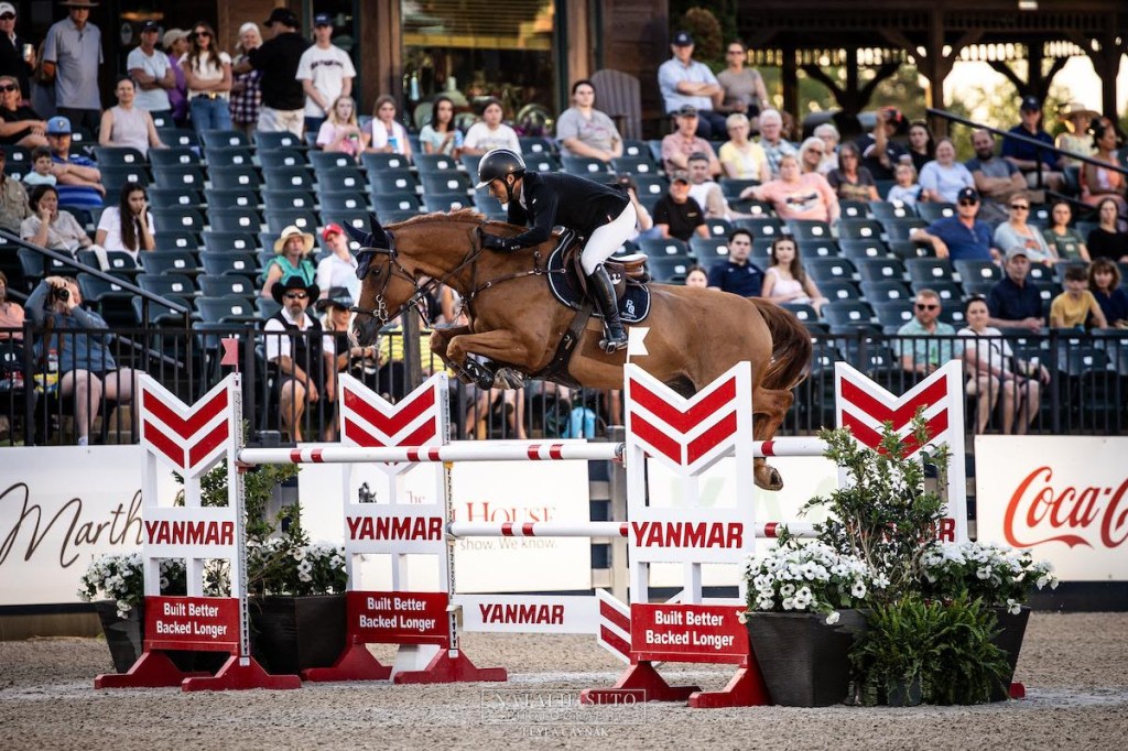Mill Spring, North Carolina, United States – May 18, 2025 – The $35,000 Bobcat Grand Prix at Saturday Night Lights presented by Skyla Credit Union handed top honors to Hunter Holloway (USA) and Henry Jota Ariel (Picadilly Tame x Henry Jota Atlantis), stopping the short course in 38.74 seconds to edge out the competition.
