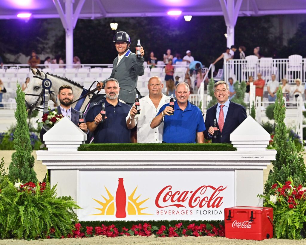 Aaron Vale (USA) & Helios du Moulin accepting their first-place awards, presented by Mason Jordan on behalf of the Roberts Family; Gary Bates, Mike Gripe, and Brian Miller representing Coca-Cola Beverages Florida; and Jim Wolf from World Equestrian Center.