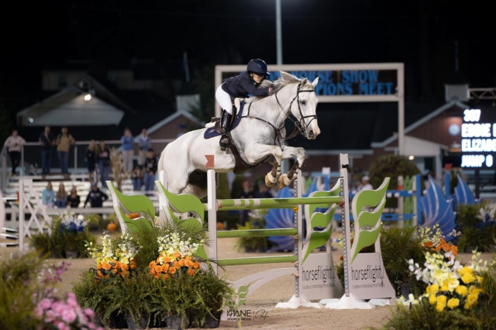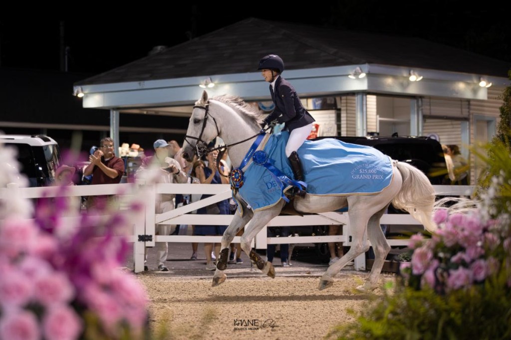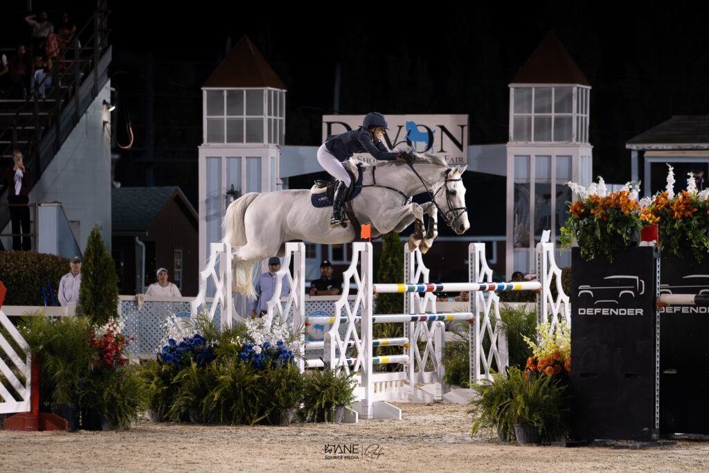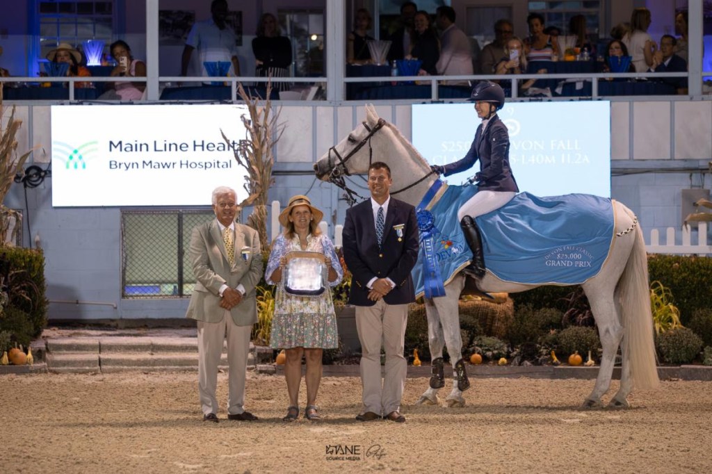 Devon, Pennsylvania – September 13, 2025 – Saturday night’s $25,000 Devon Fall Classic Grand Prix, sponsored by Bryn Mawr Hospital & Main Line Health, drew a full crowd to the Dixon Oval for the final under-the-lights class of the year. Local favorites and international riders squared off in an exhilarating seven-horse jump-off. Ultimately, Elizabeth Traband (USA) and Eddie Blue prevailed and were presented with a blue ribbon and the “Ever After” Perpetual Trophy.