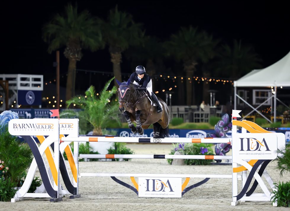 “I did my first horse, [Cosm Castlefield Cornelious], who is my five-star horse, because he jumped big classes at the end of last year,” explained Campbell. “I wanted to just jump a nice class before he jumps the CSI 5* again during Week 3. So, he came just to jump a nice, lower-pressure class under the lights. I didn’t go fast on him. I just went nicely around to set up for the CSI 5*, and then I did Palina next.”